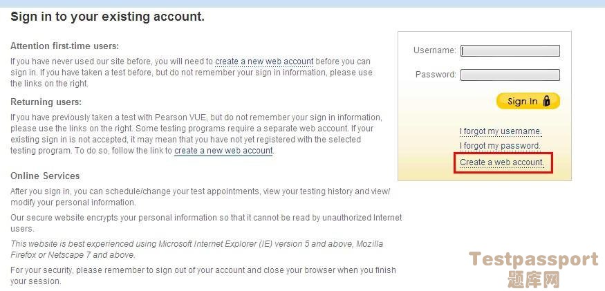 Testpassport题库网为方便广大思科考生,制作了上预约思科认证报名考试的全部流程。并配有详细的步骤操作和配图解说!因为考试中心的美元对人民币汇率一直是1:8,而网上报名可以用信用卡直接刷美金,相比1:8的汇率,采用网上报名考试相对直接到考试中心要便宜一些!提醒考生要首先具备支持美元支付的信用卡,也就是常说的双币信用卡,这种信用卡支持按账单日人民币对美元汇率转换成人民币金额还款。Testpassport题库网建议用户采用招商银行的信用卡、中国银行的长城国际信用卡、工行的牡丹国际信用卡等。简而言之,网上注册直接上VUE官方网站,注册,选考场,信用卡付款。对于从未用过VUE 的朋友来讲,先要在VUE 上注册个账号(如果已经注册过VUE 账号的请直接跳至Part Two),具体过程如下: